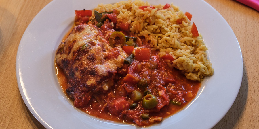 Eine flache Auflaufform mit der Hälfte des Gemüses füllen, dann den rohen Fisch darauf legen und mit dem Rest des Gemüses bedecken. Mit Käse bestreuen und für 45 Minuten im Ofen bei 180 °C überbacken. Reis nach Packungsanweisung zubereiten und zum Auflauf servieren.