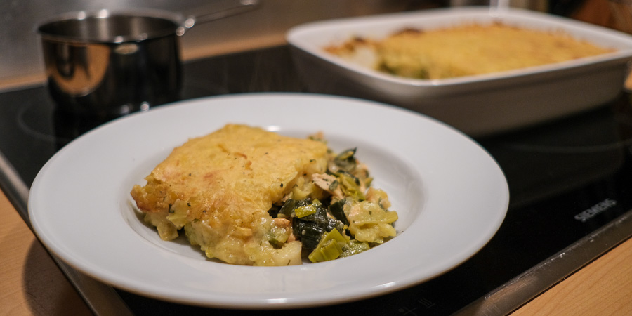 Gargekochte Kartoffeln mit den restlichen Milch und Senf zu Kartoffelbrei zerstampfen. Mit Salz und Pfeffer abschmecken. Kartoffelbrei über die Lachs-Lauch-Mischung in die Auflaufform streichen und im vorgeheizten Ofen beim 175 °C (Umluft) für 30 Minuten backen.