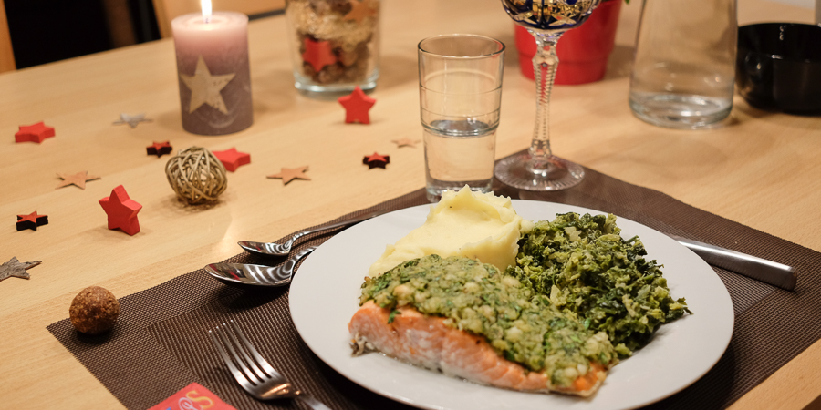 Für die Kruste Weißbrot im Zerkleinerer fein zermahlen. Nüsse grob hacken. Petersilie waschen, fein hacken. Alles mit 1 EL weicher Butter und Zitronensaft verkneten. Mit Salz abschmecken. Öl in einer Pfanne erhitzen. Lachs trocken tupfen und im Öl von jeder Seite 1-2 Minuten braten. Mit Salz und Pfeffer würzen. Lachs auf ein mit Backpapier ausgelegtes Blech legen, Nussmasse auf Fisch verteilen und leicht andrücken. Im vorgeheizten Backofen bei 200 °C Umluft 8-10 Minuten überbacken. Der Fisch soll innen noch leicht glasig sein.
