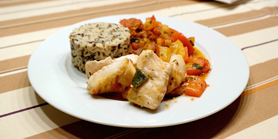Währenddessen Reis nach Packungsanweisung zubereiten. Fisch vom Gemüse nehmen und auf Tellern neben Reis und Gemüse anrichten.