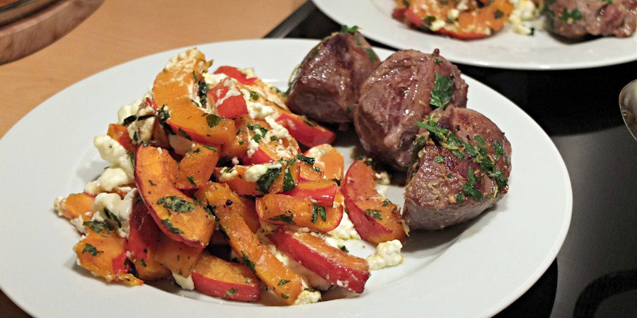 Feta und Crème Fraîche (für Kaloriensparer: Crème Legère) mit einer Gabel verrühren. 15 Minuten vor Ende der Backzeit in Klecksen auf dem Kürbis verteilen. Dann die Lammfilets trocken tupfen. 1 EL Öl in einer Pfanne erhitzen, Fleisch von allen Seiten 5-6 Minuten scharf anbraten. Pfanne ausschalten. Fleisch mit übriger Zitronenschale, Petersilie, Salz und Pfeffer würzen, 5 Minuten bei geschlossenem Deckel in der Resthitze ruhen lassen. Fleisch zusammen mit der Kürbismischung auf Tellern anrichten und servieren.