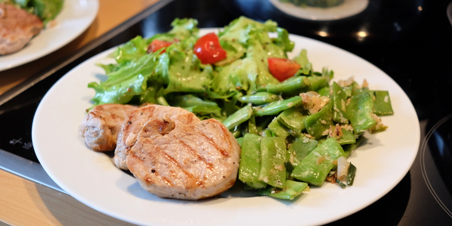 Während die Bohnen braten, Schweinelende in Medallions schneiden. Butterschmalz in einer Pfanne erhitzen, dann Lende von beiden Seiten je 2-3 Minuten anbraten. Sowohl Lende als auch Bohnen mit Salz und Pfeffer würzen, dann auf Tellern anrichten. Dazu passt grüner Salat und Weißbrot.