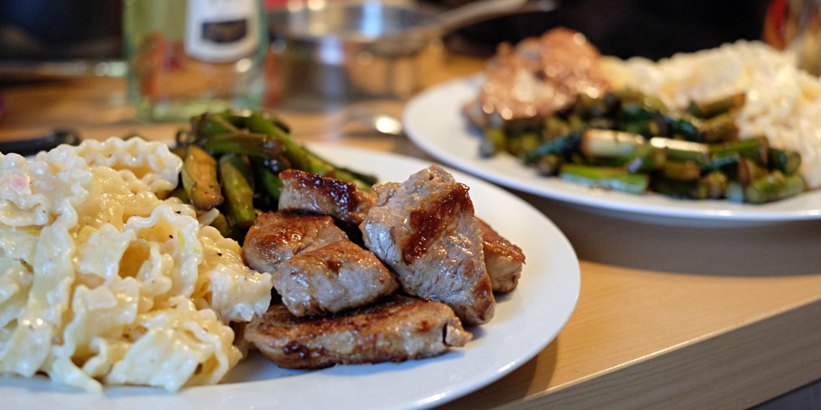 Variante: Schweinefilet mit mediterranem SpargelgemüseStatt dem grünen Spargelgemüse können Filet und Zitronennudeln auch mit gebratenem Spargel vom Blech kombiniert werden. Auf die Kartoffeln im Spargelgemüse kann in diesem Fall verzichtet werden.