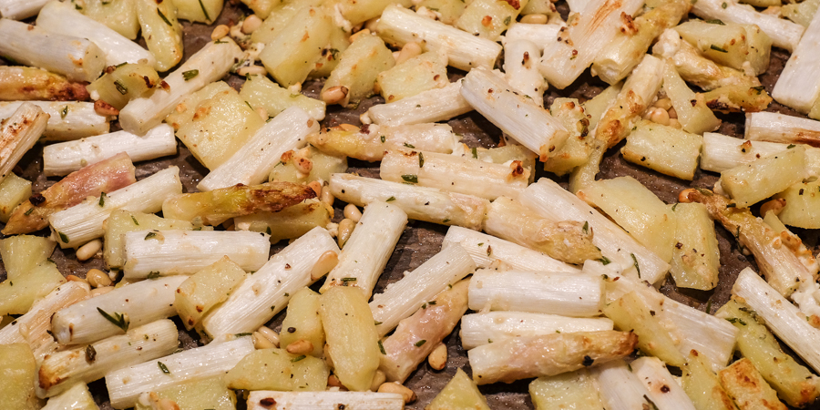 Währenddessen Backofen vorheizen. Backblech mit Backpapier auslegen und Spargelmischung darauf verteilen. Bei 200 °C für 30 Minuten backen, bis Spargel und Kartoffeln durchgegart und leicht knusprig sind.