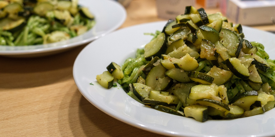 Währenddessen Nudeln in kochendem Salzwasser bissfest garen. Nudeln abgießen und sofort mit Pesto vermischen. Auf Teller verteilen und Zucchini darauf anrichten.