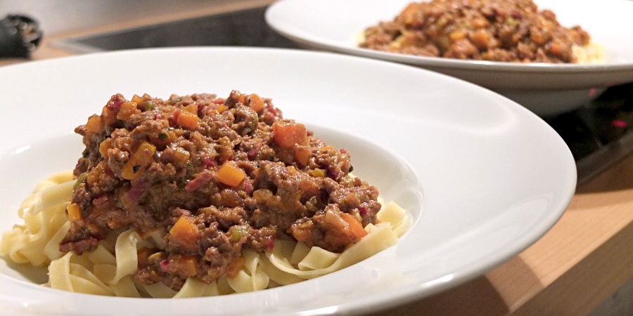 Anmerkung:Zur Bolognese werden traditionell Eierbandnudeln serviert, Spaghetti Bolognese sind eine Erfindung der nordeuropäischen Küche. Auch Kräuter findet man im Originalrezept nicht, genauso wenig wie geriebenen Parmesan. Das heißt natürlich nicht, dass man seine eigene Bolognese nicht mit ein bisschen Oregano oder Petersilie abrunden und auf dem Teller mit Parmesan bestreuen darf... Wer mutig ist, gibt zum Fleisch für eine ganz besondere Note noch etwas Geflügelleber hinzu. Statt der Dosentomaten können auch 2 EL Tomatenmark verwendet werden.