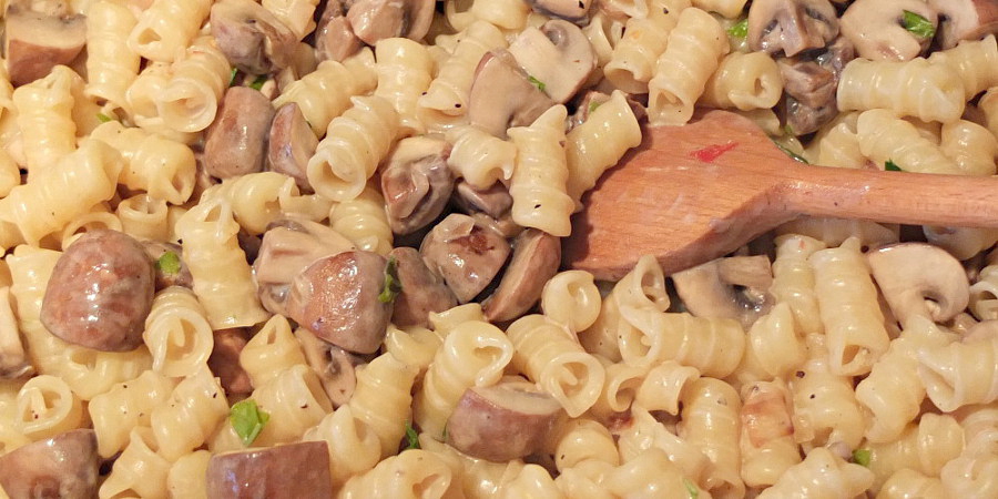 Butterschmalz in einer tiefen Pfanne erhitzen. Zwiebel feinhacken. In der heißen Pfanne für 5 Minuten anbraten. Champignons putzen und in mundgerechte Stücke schneiden. Mit in die Pfanne geben und für einige Minuten mitbraten. Mit Weißwein ablöschen und Frischkäse unterrühren. Sobald der Frischkäse vollständig zergangen ist, Pfanne vom Herd nehmen und gehackten Basilikum unterrühren. Mit Salz und Pfeffer abschmecken.