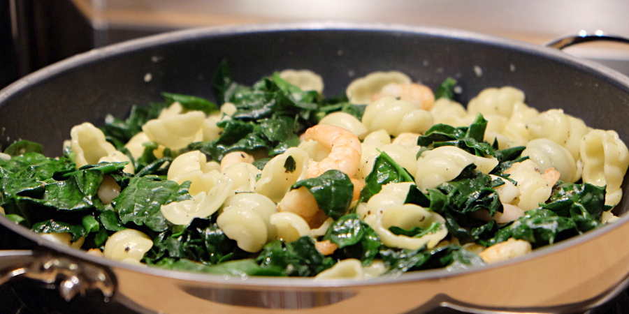 Währenddessen Nudeln bissfest kochen. Kochwasser abgießen, Nudeln in die Pfanne geben und mit Spinat und Garnelen vermischen. Auf Teller geben, Parmesan darüberreiben und servieren.
