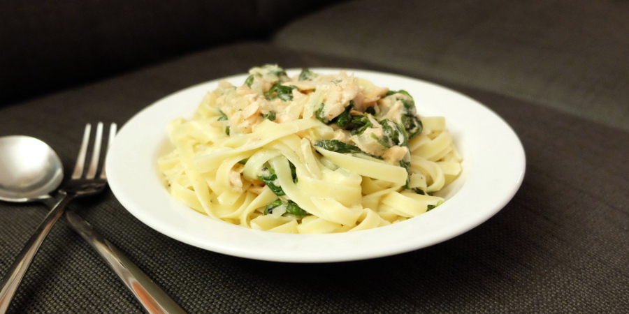 Zwiebel und Knoblauch schälen und würfeln. Butter in einer tiefen Pfanne erhitzen. Zwiebel und Knoblauch in der heißen Butter anschwitzen. Lachs in Streifen schneiden und mit in die Pfanne geben. Schmand und Frischkäse einrühren und zergehen lassen, dann Hitze auf kleinste Stufe herunterdrehen. Zitronenschale abreiben und Saft auspressen. Schale und Saft mit in die Pfanne geben. Zuletzt mit Dill, Salz und Pfeffer abschmecken. Währenddessen Nudeln nach Packungsanweisung gar kochen. In der Pfanne mit Lachs-Zitronensoße und etwas Nudel-Kochwasser vermischen, so dass eine schöne cremige Konsistenz entsteht. Auf Teller geben und servieren.