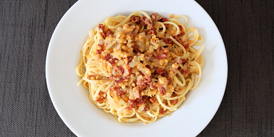 Währenddessen Spaghetti bissfest garen. Mit Linsensoße vermischen, auf Teller geben und servieren.