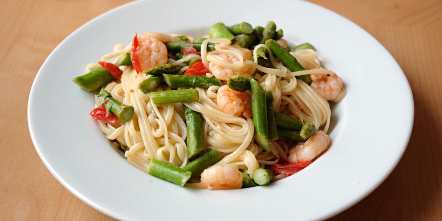 Während der Zubereitung die Nudeln bissfest kochen. Nudeln mit Gemüse und Garnelen vermischen, auf Teller geben und servieren.