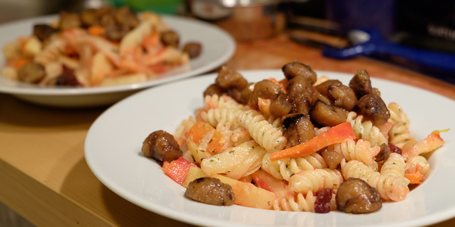 Als nächstes das Nudelwasser aufsetzen. Während das Wasser heiß wird, Butter in einer tiefen Pfanne erhitzen. Maronen vierteln. Zucker und Maronen in der Butter anschwitzen und leicht karamellisieren lassen. Mit Sahne ablöschen. Meerrettich und Zitronensaft dazugeben und auf kleiner Flamme köcheln lassen. Nudeln ins Wasser geben und bissfest kochen. Soße mit 1 EL Petersilie, Salz und Pfeffer abschmecken.