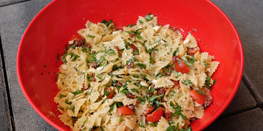 Die Nudeln bissfest kochen, abseien und gut abtropfen lassen. Pinienkerne in einer Pfanne bei mittlerer Hitze ohne Öl leicht anbräunen. Getrocknete Tomaten in Streifen schneiden (falls nötig vorher einweichen). Rucola waschen, trocken schleudern und in grobe Streifen schneiden. Mozzarella würfeln, Cocktailtomaten vierteln, Zwiebel fein hacken. Alles in eine große Schüssel geben, dann grob gehobelten Parmesan und zerbröckelten Feta unterheben.