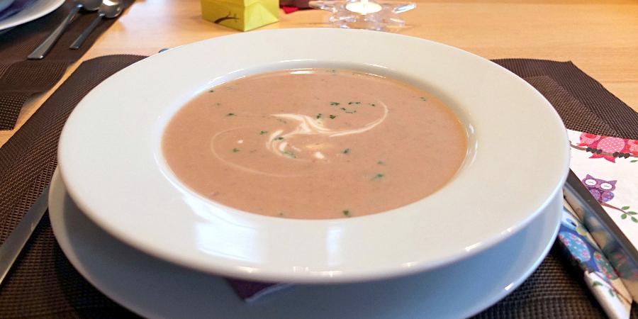 Zwiebel und Knoblauchzehe schälen und grob hacken, Speck würfeln. Butter in einem Topf erhitzen. Zwiebel, Knoblauch und Speck kurz anbraten. Maronen zugeben und ein paar Minuten mit anrösten. Mit Gemüsebrühe, Sahne und Portwein ablöschen und 15 Minuten köcheln lassen. Suppe pürieren, dann mit Salz, Pfeffer, Petersilie und ggf. noch einem weiteren Schuss Portwein abschmecken. Auf Teller geben, nach Belieben dekorieren und servieren.